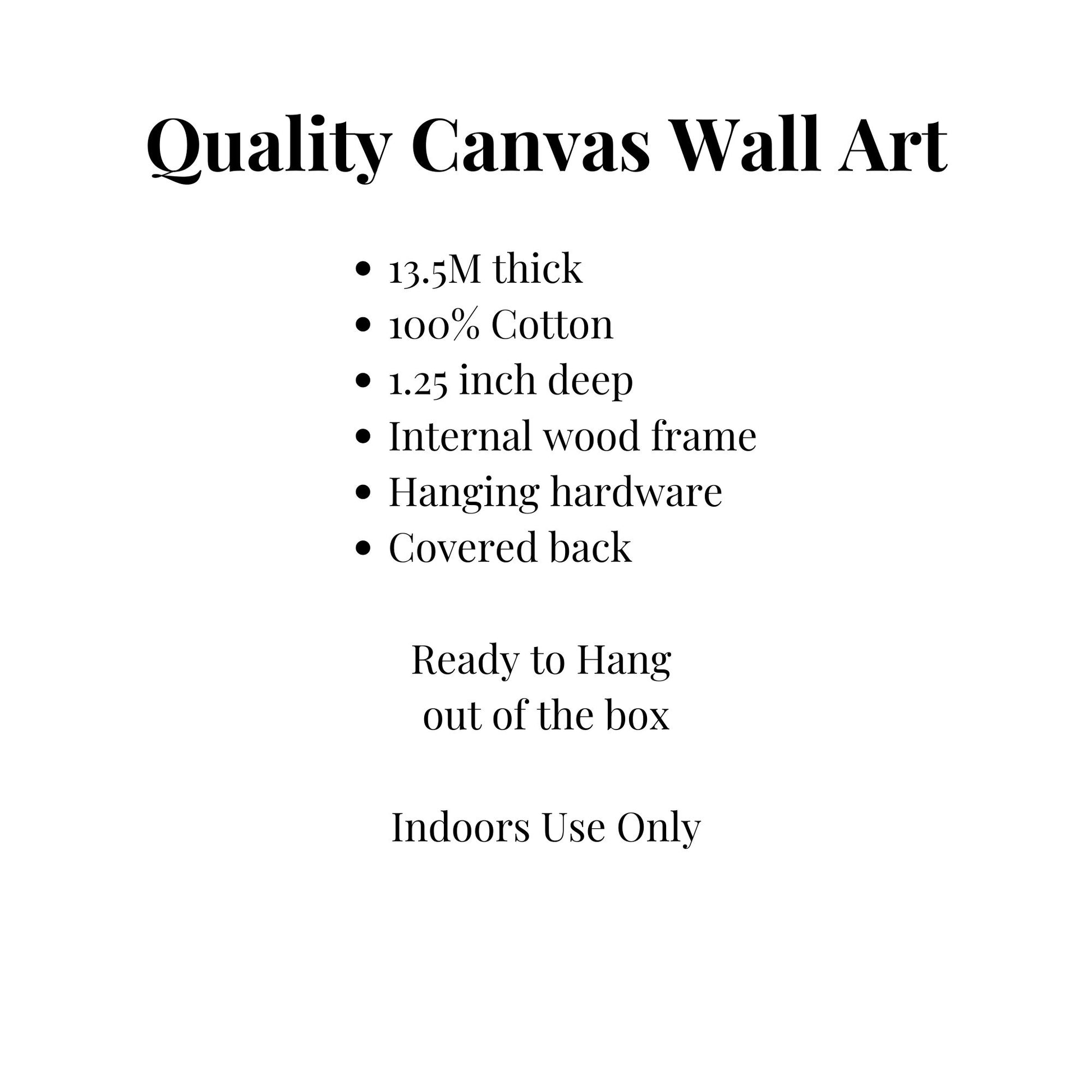 Each of my canvases are 13.5ML thick and made from 100% cotton that makes images stand out and every detail clear. The canvas is wrapped over a 1.25 inch deep wooden frame and backed with a composite that includes the hanging hardware.